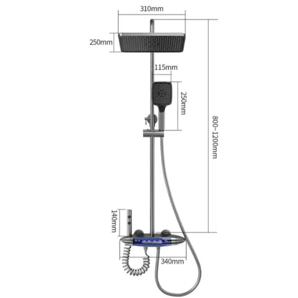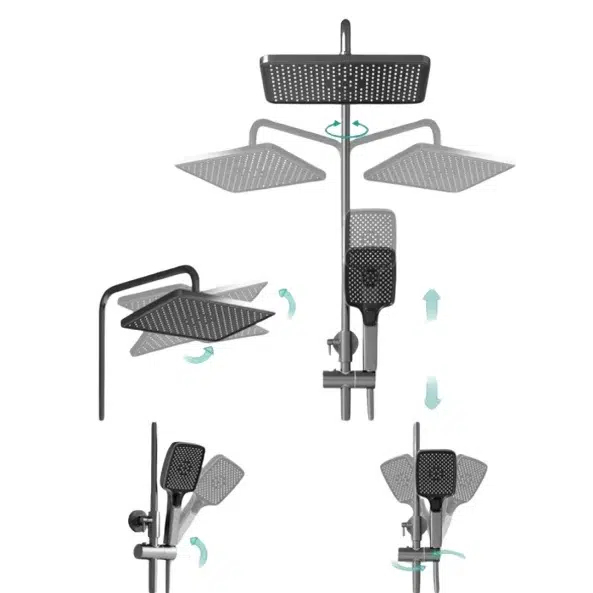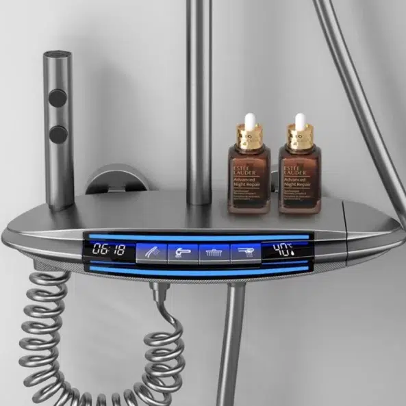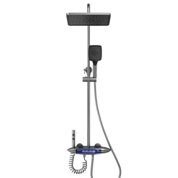 Душ комплект SmartHeater термостатен душ комплект има сив финиш, който е едновременно прост и елегантен, като ще допълни външния вид на вашата баня. Термостатен смесител с електронен дисплей. Постоянната температура на водата осигурява допълнителен комфорт и безопасност. LED цифров дисплей, амбиентно осветление. Използвайки хидроелектрическата енергийна технология, той може да показва температурата на водата в реално време, предоставяйки ви не само усещане за сигурност и комфорт, но и технологичен напредък. Иновативното амбиентно осветление прави банята живописна. Децата ще започнат да обичат душ опита и ще се радват на здравословен и щастлив живот. Четири функции. Оборудван с 4 основни функции, за да ви осигури отличен душ опит. Термостатните душ системи могат прецизно да поддържат избраната температура на водата, като ви осигуряват спокойствие по отношение на колебанията в температурата на водата по време на душ.