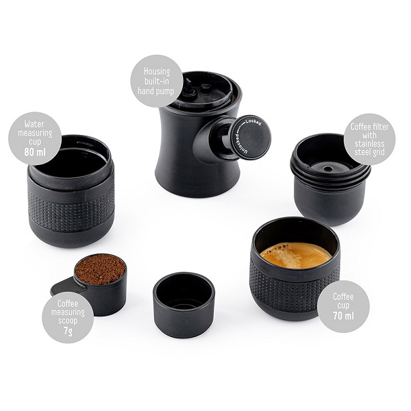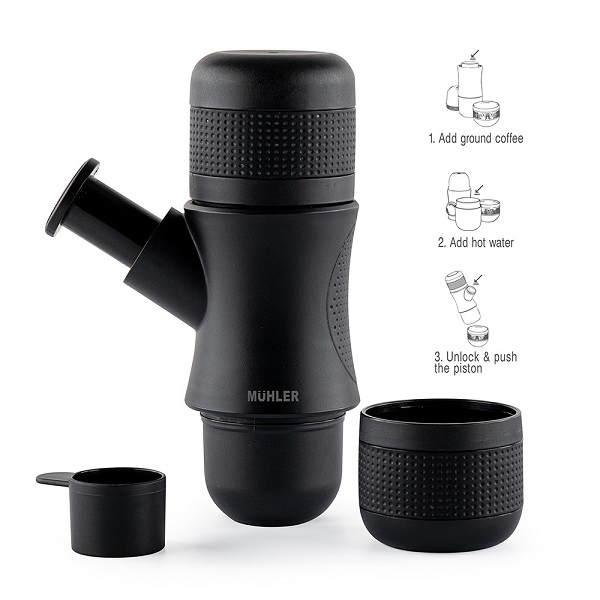 Еспресо машина Muhler MCM-99H е компактна, лека и удобна машинка за еспресо. Вградена ръчна помпа в корпуса. Филтър за кафе и мерителна чашка. Чаша за кафе и дозатор за гореща вода. Ръчна употреба, без батерии или електрическо захранване. Перфектна за туризъм, къмпинг, на път или в офиса.