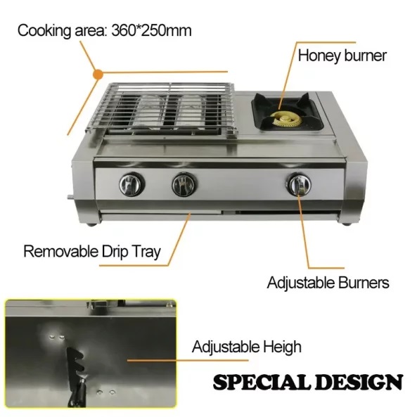 Газова скара KDM02 е оборудвана с 2 инфрачервени горелки за барбекю + 1 зона за готвене, устойчива е на много високи температури и има много бърз топло пренос. Газова скара KDM02 може да се регулира по височина за най-равномерно готвене и е снабдена с тава за събиране на мазнини , не залепващо, което улеснява почистването. Газова скара KDM02 може да се използва както на закрито, особено в ХОРЕКА зоната (ресторанти, камиони за храна и др.), каравани, така и на открито, къмпинг, барбекю, партита на открито. Изработена от устойчиви материали, скарата е много издръжлива.