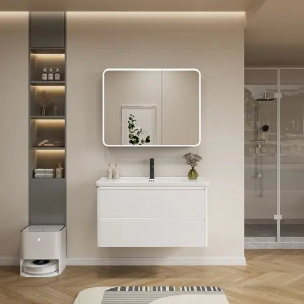 Този елегантен комплект шкафове за баня 6002 е създаден за хора, които ценят изчистения дизайн и функционалността. Окаченият шкаф с две големи чекмеджета и гланцово бяло покритие предлага достатъчно място за съхранение, а керамичната мивка осигурява комфорт при ежедневна употреба. LED огледалото с елегантна рамка и меко осветление създава модерна и уютна атмосфера. Страничният модул с открити рафтове и вградено LED осветление е идеално решение за подредба на козметика, кърпи и аксесоари, като в същото време добавя стилен акцент в банята.