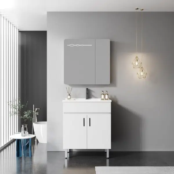 Този елегантен комплект шкаф за баня P007 комбинира модерен дизайн и функционалност, за да осигури комфорт и ред във вашата баня. Шкафът е изработен от висококачествени материали с устойчиво покритие, което предпазва от влага и улеснява поддръжката.