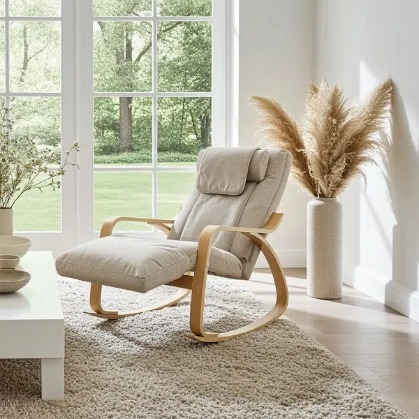 Извитите дървени основи осигуряват плавно и балансирано люлеене, което създава усещане за спокойствие и уют. Благодарение на съвременния си дизайн, столът се вписва отлично както в хол, така и в спалня или детска стая. Люлеещите се столове са известни със своя релаксиращ ефект и комфорт, като нежното движение подпомага отпускането и намалява напрежението.