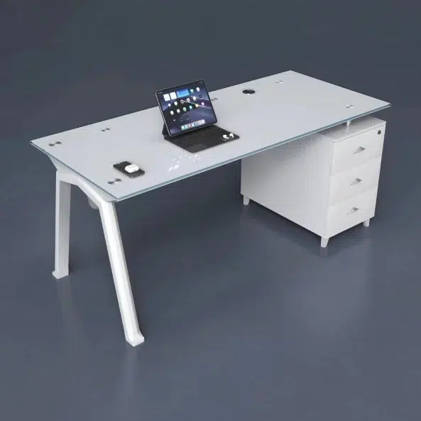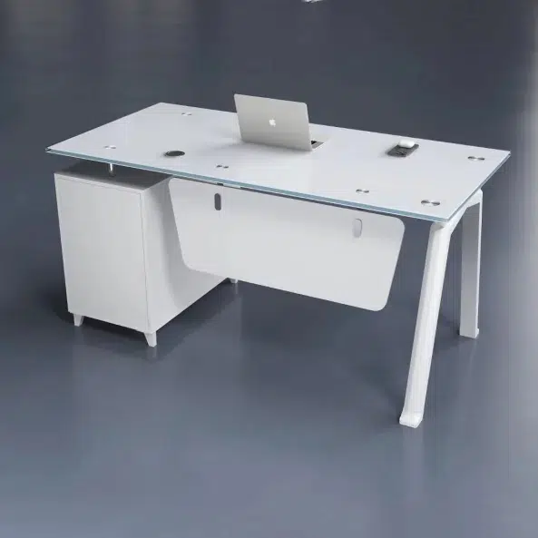 Офис бюро White CD03 стилно и изискано бюро е идеално за модерни работни пространства, предлагайки минималистичен дизайн и оптимална функционалност. Фиксиран страничен шкаф разполага с три просторни чекмеджета, включително едно с ключалка, за ефективна организация на документи и аксесоари.