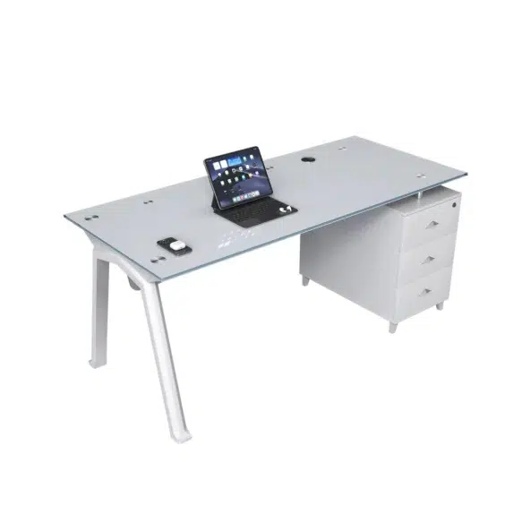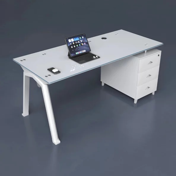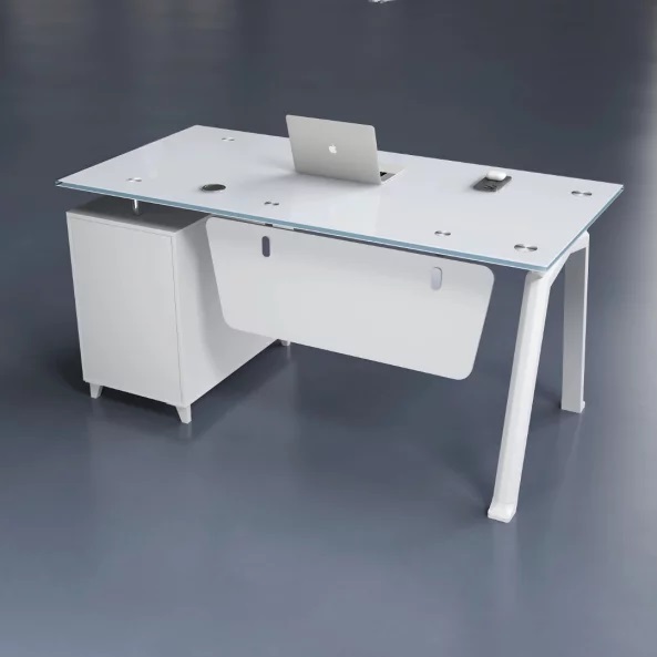 Офис бюро White CD04 е стилно и изискано бюро е идеално за модерни работни пространства, предлагайки минималистичен дизайн и оптимална функционалност. Фиксиран страничен шкаф разполага с три просторни чекмеджета, включително едно с ключалка, за ефективна организация на документи и аксесоари.