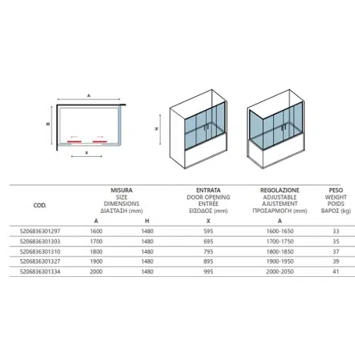 Параванът Flora 300 се състои от две стационарни стъкла и две плъзгащи врати. Предлага се пет размера.