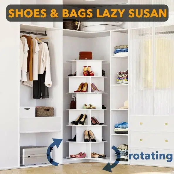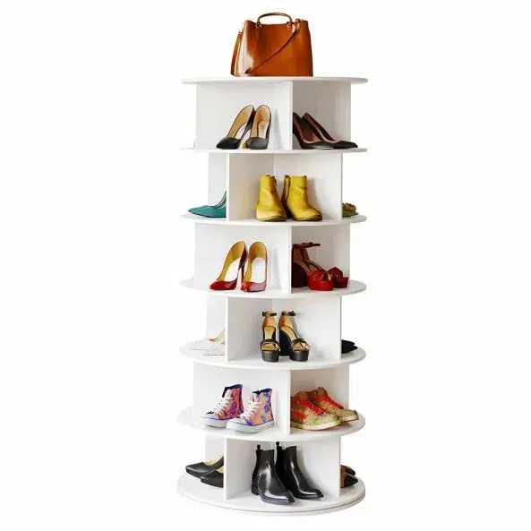 Поставка за обувки е изработена от издръжливи дървени и пластмасови материали, тази поставка предлага модерен и елегантен дизайн, който се вписва идеално във всяка стая. Подобрете пространството си за съхранение с тази въртяща се поставка за обувки, идеална за ефикасно организиране на обувките ви.
