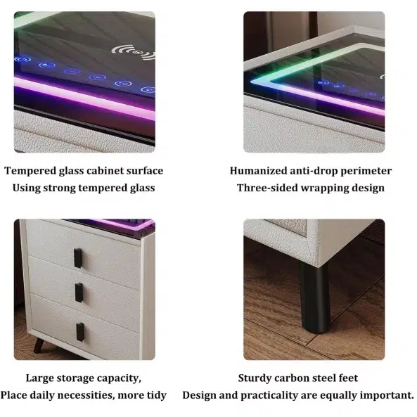 Smart нощно шкафче M3125 съчетава модерните технологии с елегантен дизайн и е изработено от висококачествени материали: закалено стъкло, PU (полиуретанова) кожа, MDF плоскост, дъбово дърво, желязо и издръжлива пластмаса. Модерният дизайн на Smart нощно шкафче M3125 го правят това нощно шкафче не само практична мебел, но и елегантен декоративен елемент, подходящ за всяка спалня или офис.