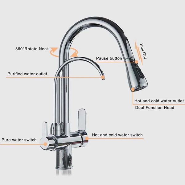 - Ръкохватки: Едноръкохватков смесител за топла/студена вода, отделна ръкохватка за филтрирана вода