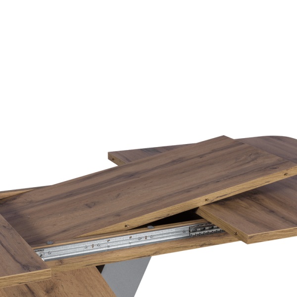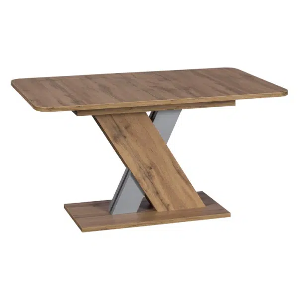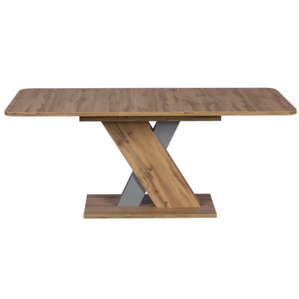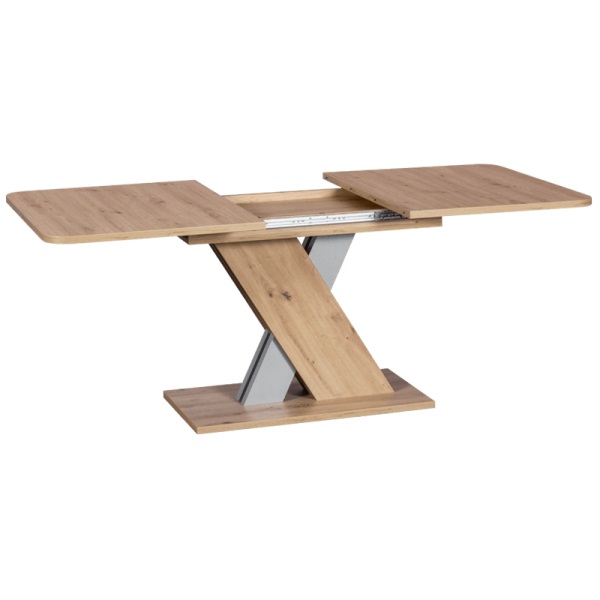 Трапезна маса DINAR е модел от ново поколение с интересен, стилен дизайн и практична функция за разтягане. Тя съчетава нестандартна основа, наподобяваща буквата X и правоъгълен плот със заоблени ъгли. Дървесната шарка и нежнините, меки цветове ще направят трапезарията елегантна и уютна. Трапезната маса DINAR може да се разтегне бързо и лесно чрез плавен и безшумен механизъм. С негова помощ и допълнителна плоскост плотът на масата достига до дължина от 180 см. Така винаги сте готови да посрещнете още гости на трапезата.