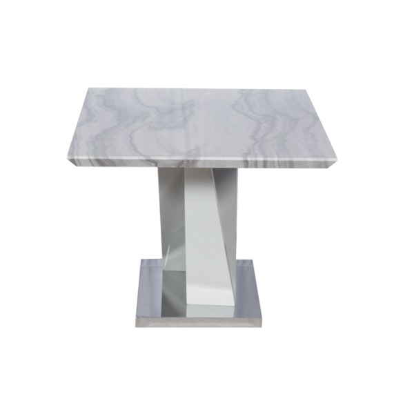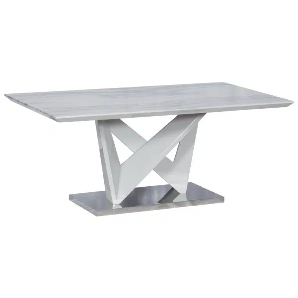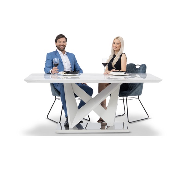 Трапезна маса GEORGIA е масивна трапезна маса с оригинален и стилен дизайн. Моделът е с голям плот с размери 180 х 100 см., който е изработен от МДФ материал с покритие в мраморен цвят. Интересната основа с необичайна форма също е направена от МДФ, а в долната част от неръждаема стомана. Масата е изработена от висококачествени материали. За долната част на основата е използвана неръждаема стомана, която освен здравина, придава също и луксозен вид на модела. Плотът е изработен от МДФ с 48 мм дебелина и гланцово покритие, устойчиво на удари и надрасквания. Цялата конструкция осигурява отлична стабилност, благодарение на своята форма и висококачествени материали, запазва външния си вид с години.