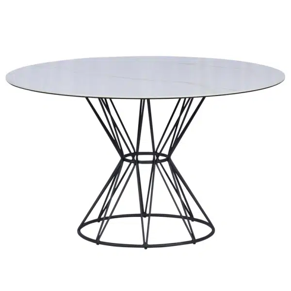 Трапезна маса LOMZA е модерна трапезна маса с разчупена метална основа и кръгъл плот, изработен от керамика и закалено стъкло, с дебелина 12 мм. Стилна и елегантна, тя е чудесно решение за обзавеждане на съвременното жилище. Модел LOMZA се отличава с изчистени линии, стилен дизайн и висококачествена изработка. За базата е използван метал, праховобоядисан, в елегантен черен цвят, което й придава допълнително усещане за лукс. Плотът на масата е направен от керамика и здраво закалено стъкло, с дебелина 12 мм. Комбинацията от висококачествени материали гарантира здравината, издръжливостта и безпроблемната употреба на модела.