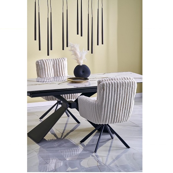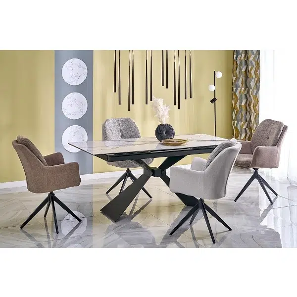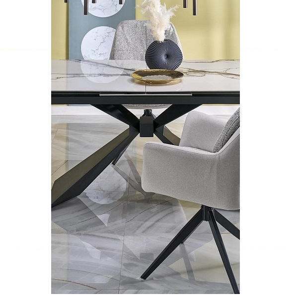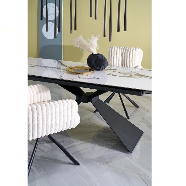 Трапезна маса LUCIANO е елегантно и практично решение за съвременния дом. Със своя изчистен дизайн и разтегателна конструкция, тя лесно се адаптира както за ежедневни семейни вечери, така и за по-големи събирания. Плотът е изработен от керамика с бяло мраморно покритие – издръжлив, устойчив на надраскване и лесен за поддръжка материал, който придава луксозен и стилен акцент на интериора. Краката са от прахово боядисана черна стомана, със семпъл и здрав дизайн, който създава модерен контраст и стабилност.