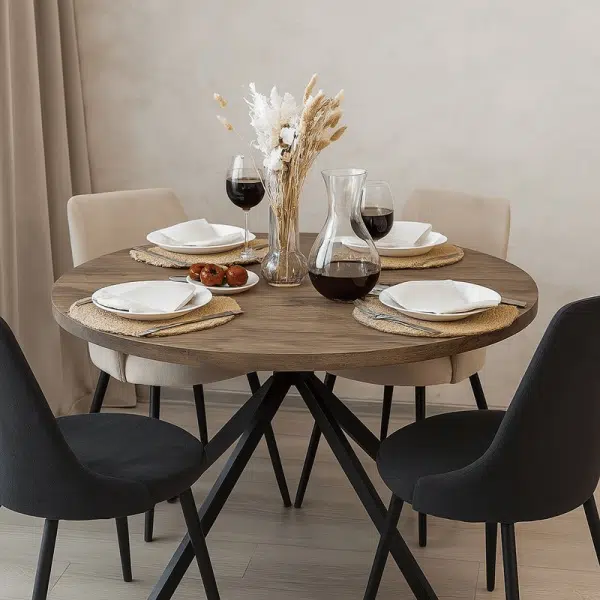 Трапезна маса LUDVIKA впечатлява със своята солидна конструкция и стилна визия. Кръглият плот с диаметър 120 см е изработен от MDF с дебелина 40 мм, който съчетава естетика и устойчивост. Металната основа на трапезна маса LUDVIKA е с прахово боядисано покритие което осигурява стабилност и модерен завършек.