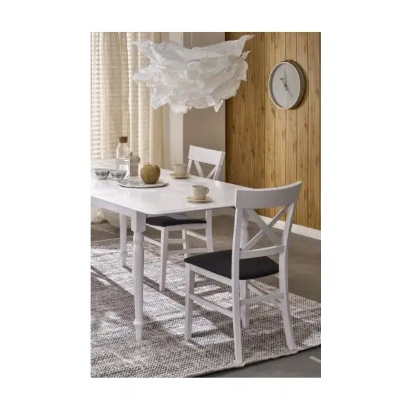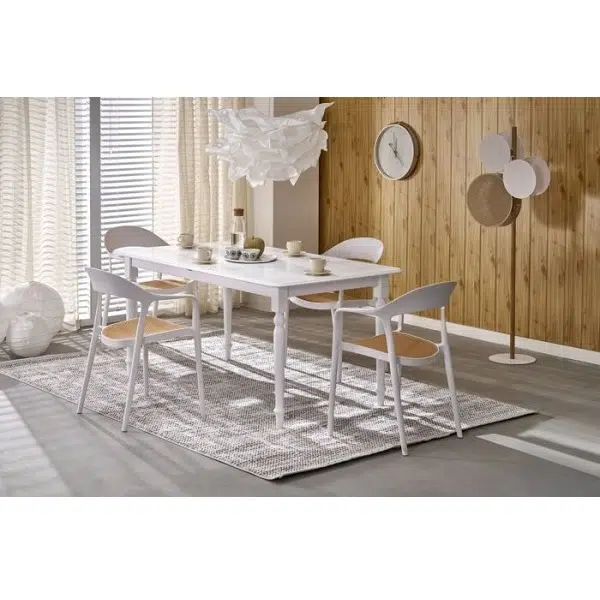 Трапезна маса NELSON е изработена в практични размери и в стил, подходящ за всяка кухня или трапезария. Съчетавайки класически форми, лакирана бяла повърхност и масивна дървесина, тя създава перфектната основа за семейни вечери, споделени закуски и разговори, които продължават дълго.