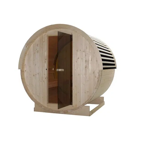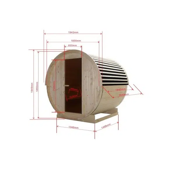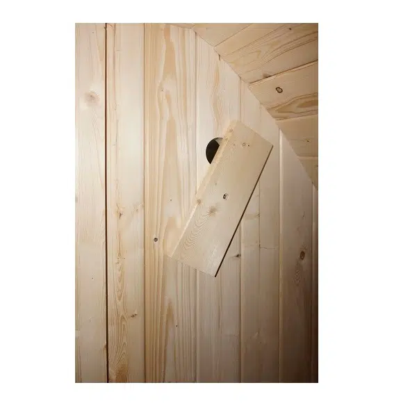 Кабината е изработена от естествена смърчова дървесина, която създава уютна атмосфера и изпълва пространството с приятен дървесен аромат. Този материал е предпочитан при сауни заради отличните си изолационни свойства и способността си да създава комфортен вътрешен климат.