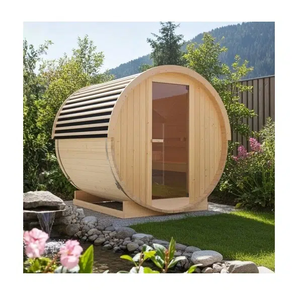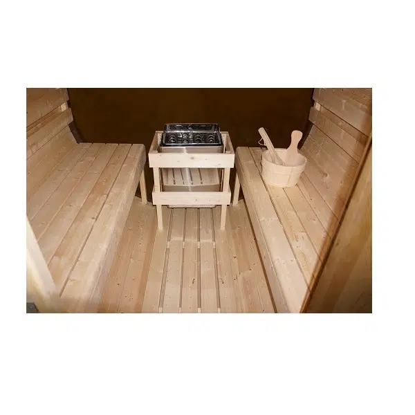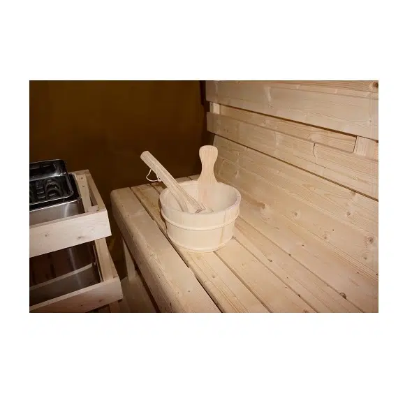 - Аксесоари: Нагревател за сауна, включително камъни за сауна, кофа, черпак, термометър, пясъчен часовник