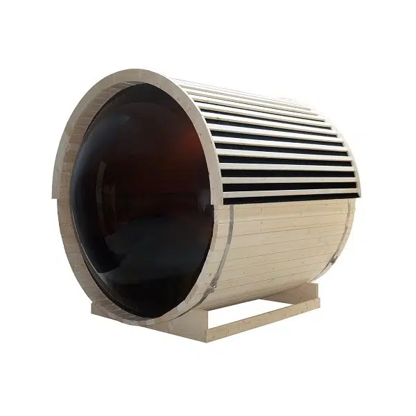 Истинският акцент в дизайна е извитото тонирано панорамно стъкло в задната част на сауната. То позволява да се наслаждавате на гледката към природата по време на сауна сесията и превръща всеки момент на релакс в уникално изживяване. Входът е оборудван със стилна 6 мм стъклена врата, а елегантният покрив допълва модерната визия на кабината.