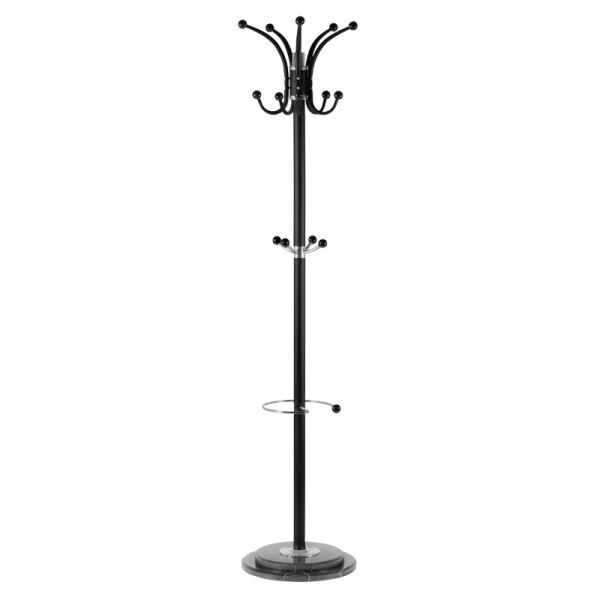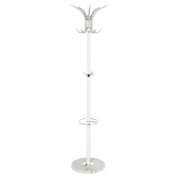 Закачалка за дрехи от метално тяло, мраморна основа и стилни декоративни елементи. Подходяща е за аранжиране във входни помещения, антрета или коридори. Закачалка за дрехи Carmen е стилно и практично решение за закачане на дрехи и аксесоари, което ще внесе свежест и ред в помещението. Изработена е от метално тяло в съчетание с двойна мраморна основа, което е гаранция за издръжливост и надеждност при експлоатация. Прахово боядисана в нежен бял цвят, тя ще се впише без проблем към всеки интериор. Разполага с три нива на закачане: горно с два реда по пет броя куки, средно ниво за чанти с четири куки и долно ниво, което представлява специална поставка за чадъри. Декорирана е с красиви овални елементи, които допълват изяществото и придават още по-изискан вид. Закачалка за дрехи Carmen е функционално решение за вашето обзавеждане, което ще спомогне за поддържането на реда в дома или офиса.